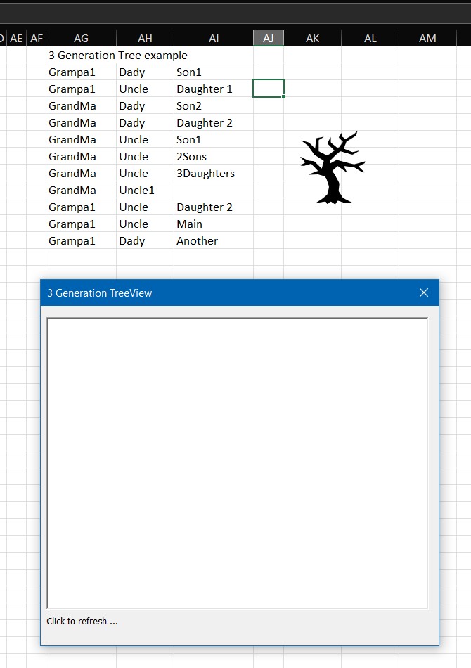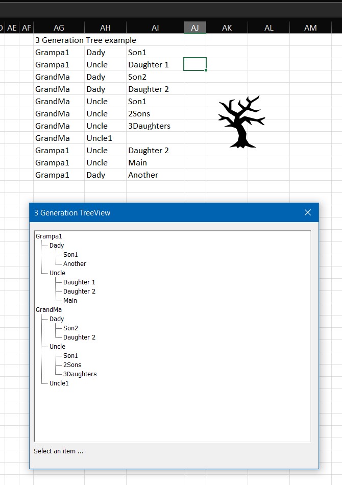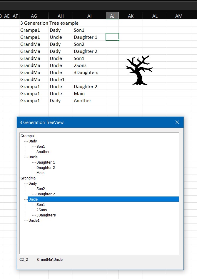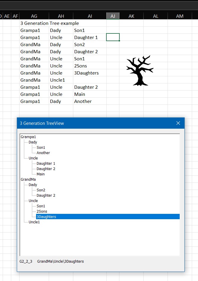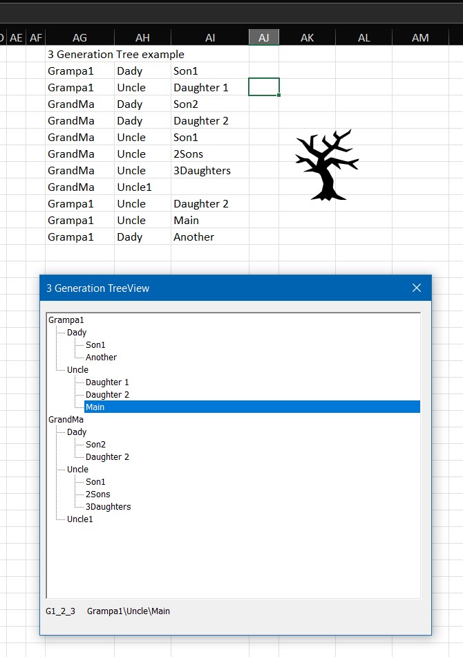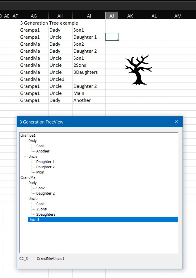 Converts 3 columns in sheet into 3-generation tree using TreeView from Mscomctl.ocx
