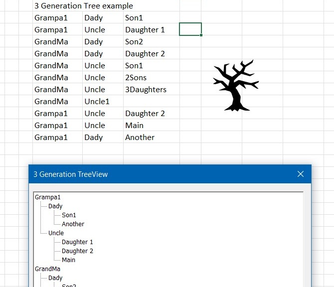 Converts 3 columns in sheet into 3-generation tree using TreeView from Mscomctl. ...